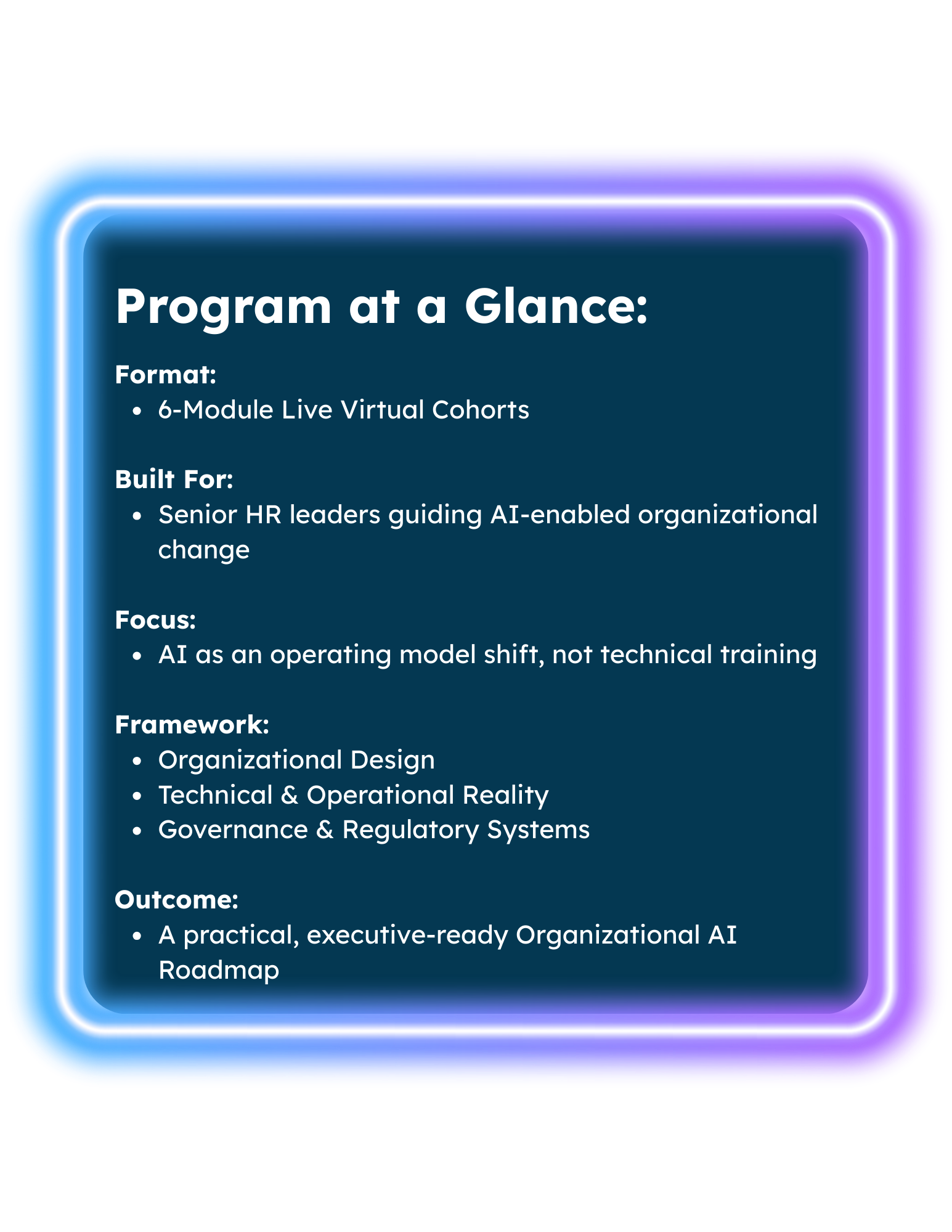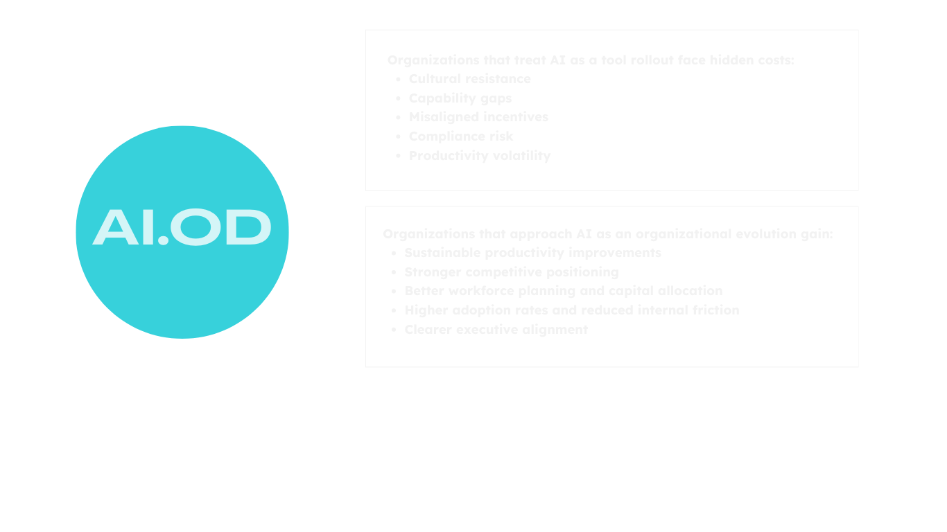 AI.OD is built specifically for HR leaders, equipping them to guide organization-wide AI evolution with clarity, structure, and executive influence.